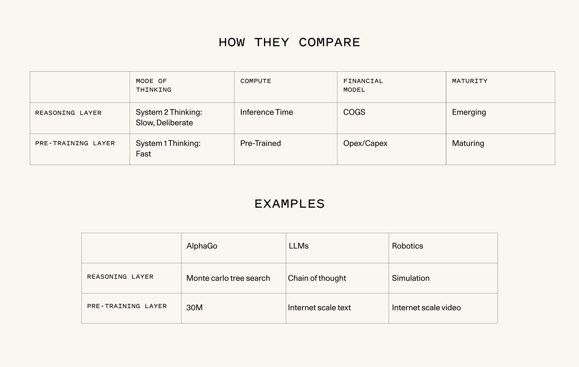 As the LLM market structure stabilizes, the next frontier is now emerging. The focus is shifting to the development and scaling of the reasoning layer, where “System 2” thinking takes precedence. Inspired by models like AlphaGo, this layer aims to endow AI systems with deliberate reasoning, problem-solving and cognitive operations at inference time that go beyond rapid pattern matching. And new cognitive architectures and user interfaces are shaping how these reasoning capabilities are delivered to and interact with users.