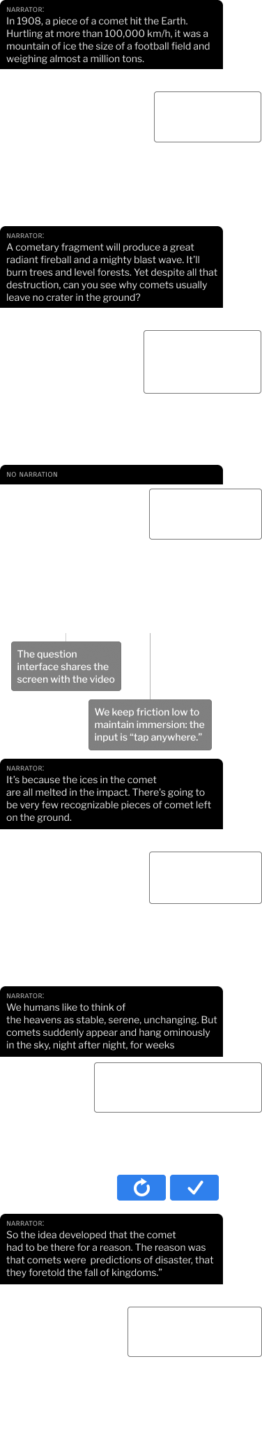 - **Make sure the early questions in a mnemonic essay are trivial: it helps many users realize they aren’t paying enough attention as they read:Note added December 9, 2019: This claim appears to be based on an error in our data analysis, and is now retracted. We’ve left the text in for historic reasons, but we no longer believe the claim.** This was a discovery made when we released the first *Quantum Country* essay. Anticipating that users would be struggling with a new interface, we deliberately made the first few questions in the essay utterly trivial – sort of a quantum equivalent to “2+2 =?” – so they could focus on the interface. To our surprise, users performed poorly on these questions, worse than they did on the (much harder) later questions. Our current hypothesis to explain this is that when users failed to answer the first few questions correctly it served as a wakeup call. The questions were so transparently simple that they realized they hadn’t really been paying attention as they read, and so were subsequently more careful.