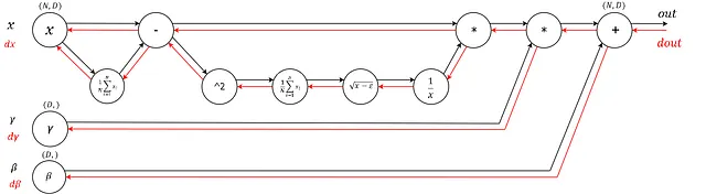 Some eye candy: a computational graph of a Batch Norm layer with a forward pass (black) and backward pass (red). (borrowed from this post )