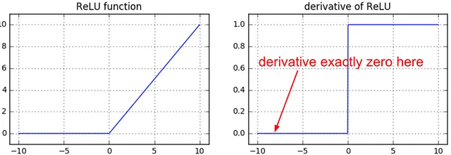 If you stare at this for a while you’ll see that if a neuron gets clamped to zero in the forward pass (i.e. **z** =0, it doesn’t “fire”), then its weights will get zero gradient. This can lead to what is called the “dead ReLU” problem, where if a ReLU neuron is unfortunately initialized such that it never fires, or if a neuron’s weights ever get knocked off with a large update during training into this regime, then this neuron will remain permanently dead. It’s like permanent, irrecoverable brain damage. Sometimes you can forward the entire training set through a trained network and find that a large fraction (e.g. 40%) of your neurons were zero the entire time.