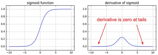 Another non-obvious fun fact about sigmoid is that its local gradient (z\*(1-z)) achieves a maximum at 0.25, when z = 0.5. That means that every time the gradient signal flows through a sigmoid gate, its magnitude always diminishes by one quarter (or more). If you’re using basic SGD, this would make the lower layers of a network train much slower than the higher ones.