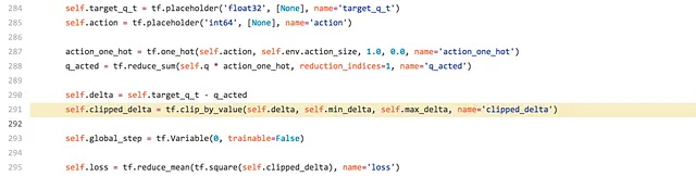 Lets look at one more — the one that actually inspired this post. Yesterday I was browsing for a Deep Q Learning implementation in TensorFlow (to see how others deal with computing the numpy equivalent of **Q\[:, a\]**, where **a** is an integer vector — turns out this trivial operation is not supported in TF). Anyway, I searched *“dqn tensorflow”*, clicked the first link, and found the core code. Here is an excerpt: